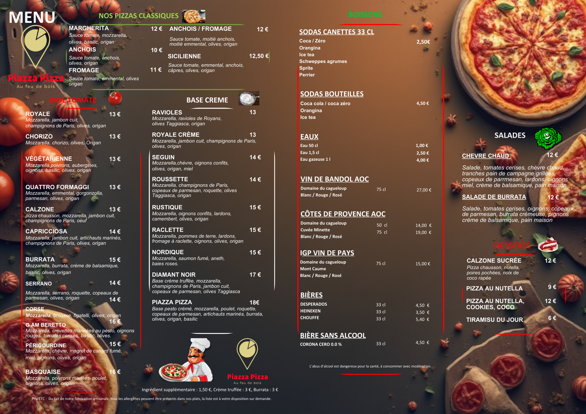 Bienvenue chez Piazza Pizza à Bandol, où la qualité est notre priorité. Nous prenons soin de chaque détail pour vous offrir une expérience de dégustation de pizzas inoubliable. Nos pizzas artisanales sont préparées à la main avec une pâte fraîche et légère, des ingrédients sélectionnés avec soin et une cuisson au feu de bois pour une saveur authentique. Notre équipe souriante et professionnelle vous accueille avec chaleur pour un moment de détente entre amis ou en famille. Commandez à emporter ou en livraison et découvrez notre passion pour les pizzas de qualité.